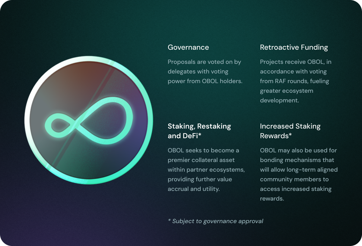 The OBOL token is quickly becoming the schelling point of the Obol Collective, serving as the central force behind its governance, incentives and operations. It empowers delegate voting on proposals, allocates ecosystem funding through RAF rounds, and will play a key role in staking, restaking, and DeFi. Additionally, OBOL has the potential to enhance staking rewards through novel mechanisms, ensuring long-term alignment within the community. As adoption grows, OBOL is poised to become a premier collateral asset across partner ecosystems, further driving its value and utility.