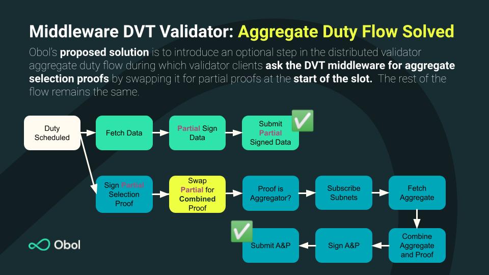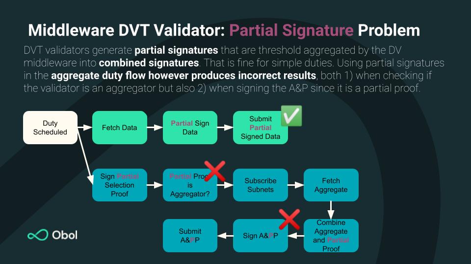 - Note this final signed aggregate and proof is itself a partial aggregate and proof. But since it contains the combined selection proof, the DVT middleware is able to threshold aggregate it into a combined signed aggregate and proof which is submitted to the beacon chain.