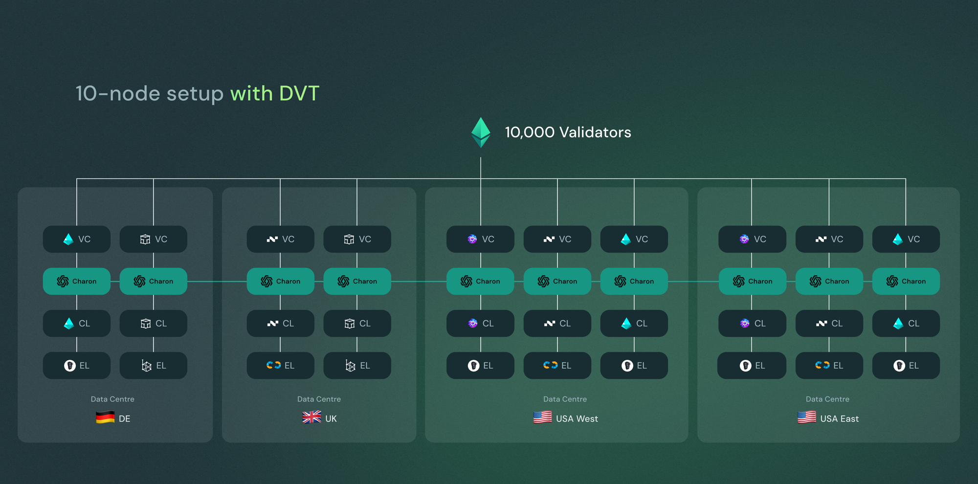 Obol’s Distributed Validator Technology (DVT) is a technology primitive that allows validators to be run by a cluster of nodes. As long as two-thirds of the nodes are active, the cluster as a whole remains active. (This could be 3-of-4, 5-of-7, or 7-of-10 for example) This builds in a level of fault tolerance — let’s imagine our example node operator uses their 10 machines to create a DVT cluster. Now, as long as 7 out of 10 of the machines remain online, the entire cluster stays online, and all 10,000 validators remain active. As before, the node operator can run the machines in different data centres and with different client combinations to increase the robustness of the entire cluster, eliminating the possibility of a validator (or group of validators) being affected by an issue with a single client or machine.