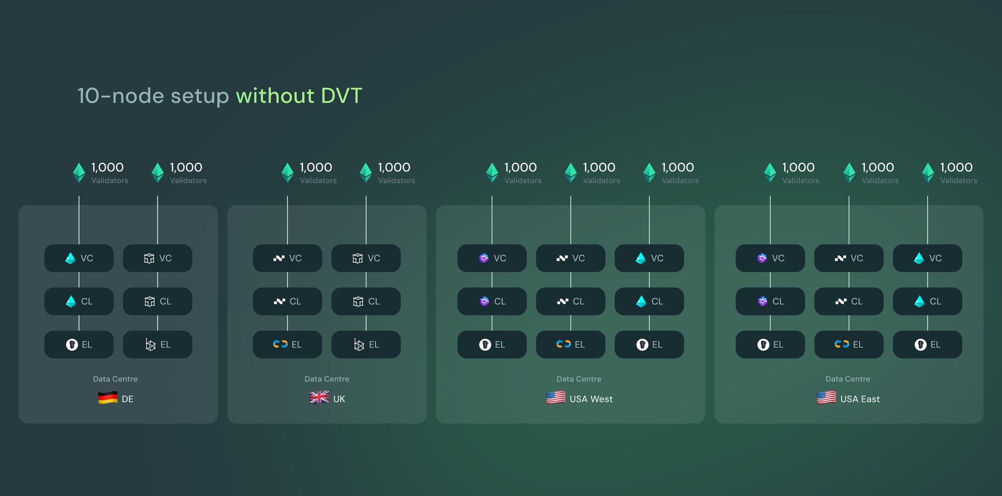 A StaaS provider responsible for thousands of validators will typically run them from multiple nodes, spread across several data centres, with a healthy mix of execution and consensus clients. As an example, a StaaS provider running 10,000 validators may use 10 machines with 1,000 validators running on each machine. If a single machine goes offline, 1,000 validators go offline. Running backup systems creates a significant risk of slashing, which occurs if the same validator key is run from two nodes at the same time, for example in the event that the primary machine comes back online unexpectedly. Therefore, active-active setups are virtually impossible to safely run in Ethereum.