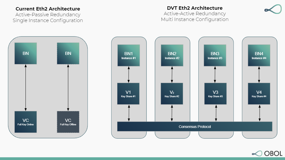 Distributed Validators divide a single Ethereum validating key across four or more beacon node instances that come to consensus to decide on what should be signed by the validator. Threshold signature schemes can be used, which allow for a portion of the instances to be offline (e.g., 2 of 7) creating superior fault tolerance to the validator set-ups used today. This is known as Active Active redundancy in the Web2 world (many servers online simultaneously).