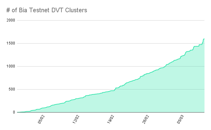 Now, as we near the end of the Bia testing program, we are left feeling even more encouraged about the enthusiasm the community has for DVT and the value it can provide for Ethereum. In the ~60 days since we launched the Bia testing program, we have seen 1600+ distributed validator clusters registered, consisting of 9000+ nodes.